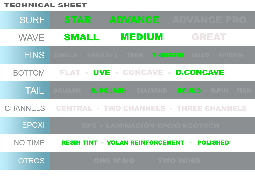 NIVEL DE SURF: INICIO/AVANZADO | OLAS: 0,5 A 2 M | 3 FINS | BOTTOM: UVE+2W CONCAVE | TAIL: SQUASH/ROUND | OPCIÓN NO TIME LINE