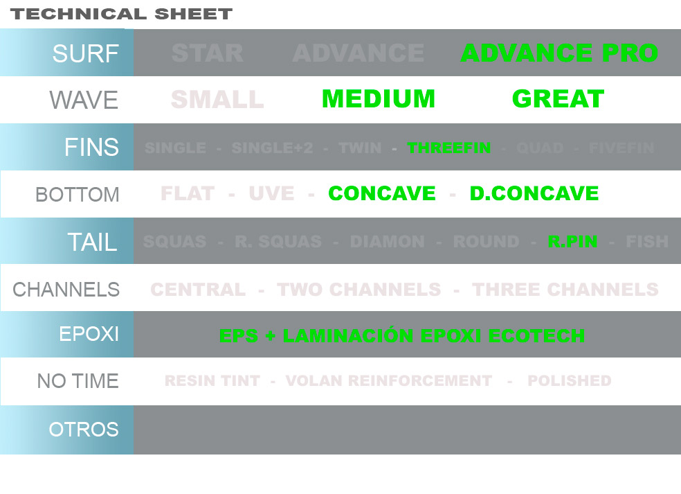 NIVEL DE SURF: AVANZADO / PRO | OLAS: 3/4 A 2 M | 3 - 4 QUILLAS | BOTTOM: CONCAVO A DOBLE CÓNCAVO | TAIL: ROUND PIND | OPCIÓN ECOTECH