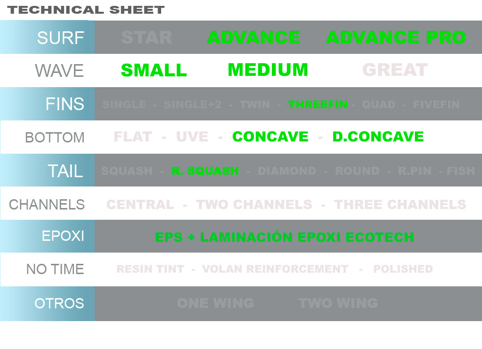 NIVEL DE SURF: AVANZADO/PRO | OLAS: 0,5 A 2 M | 3 QUILLAS | BOTTOM: CONCAVO A DOBLE CÓNCAVO | TAIL: ROUND SQUASH | OPCIÓN ECOTECH