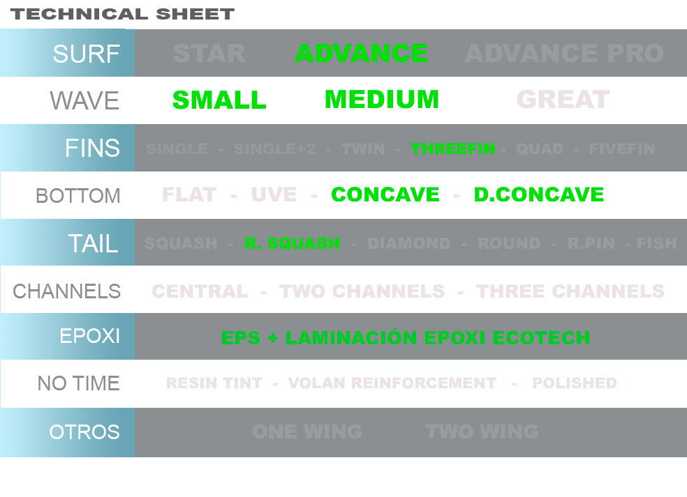 NIVEL DE SURF: AVANZADO | OLAS: PLAYA 0,5 A 1,5 M | 3 QUILLAS | BOTTOM: CONCAVO A DOBLE CÓNCAVO | TAIL: ROUND SQUASH Y FISH | OPCIÓN ECOTECH