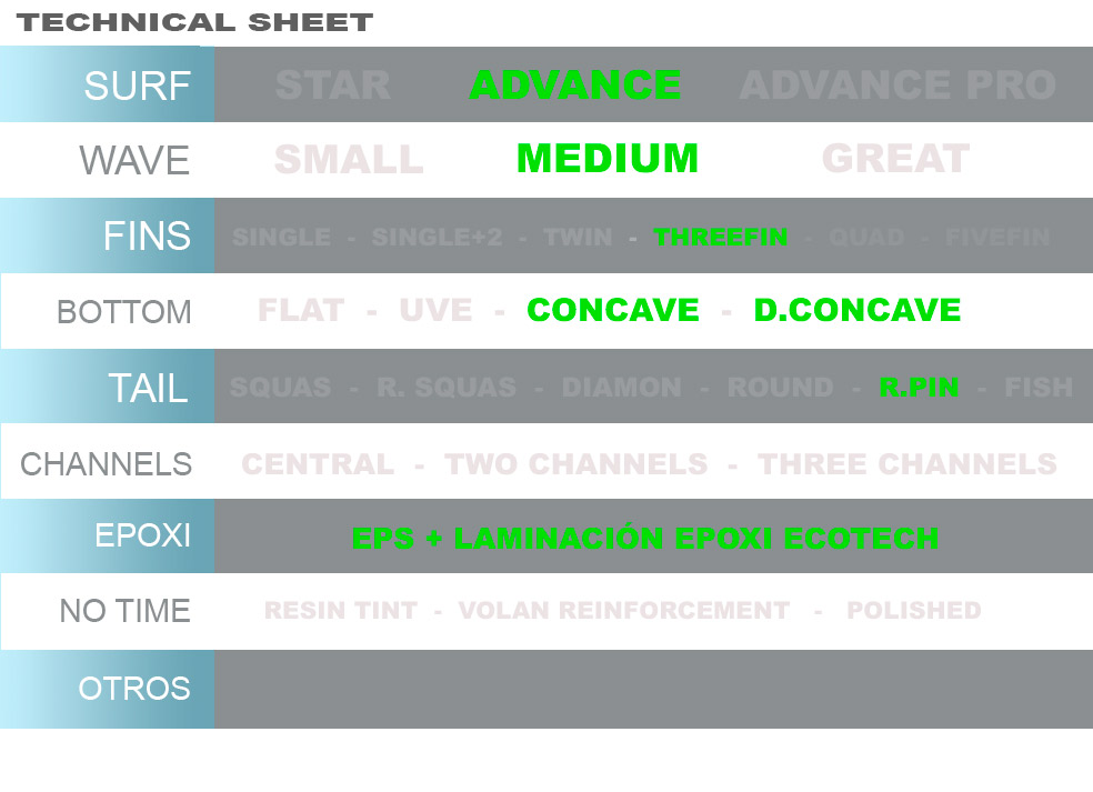 NIVEL DE SURF: AVANZADO | OLAS: 0,5 A 1.5 M | 3 QUILLAS | BOTTOM: CONCAVO A DOBLE CÓNCAVO | TAIL: ROUND PIN | OPCIÓN ECOTECH